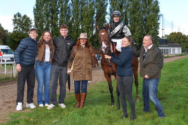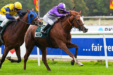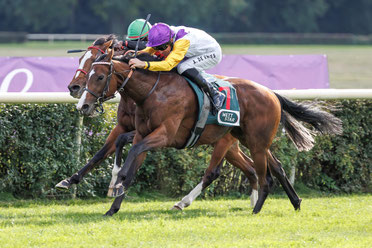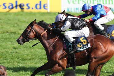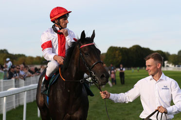 Da Andrasch Starke in Paris im Einsatz war, kam unser Auszubildender Esentur Turganaaly Uulu in Hannover zum Einsatz und konnte gleich zwei Siege feiern. Mit dem zweijährigen Abachi vom Stall Nizza gewann er im Endkampf gehen den Championjockey Thore. In den Japan-Sohn Abachi steckt man viel Hoffnung, so könnte es für ihn in das Herzog von Ratibor Rennen gehen Mitte November. Der zweite Sieg holte Esentur mit der Schlenderhanerin Sorceress. Er lieferte ihr ein schönes Rennen, sodass sie sich im Einlauf sicher lösen konnte. Pearly Sparkle lief erst ihr zweites Rennen. Die Fährhoferin braucht etwas mehr Zeit, beim nächsten Start wird sie das gelernte mitnehmen und dann könnte es nach zwei dritten Plätzen ganz nach vorne reichen. Im Listenrennen konnte Asteria leider keine Akzente setzten.
