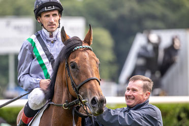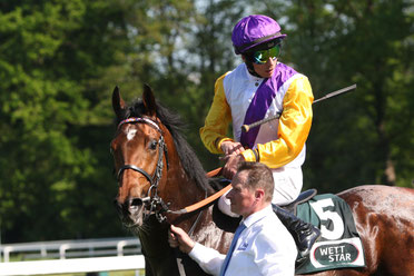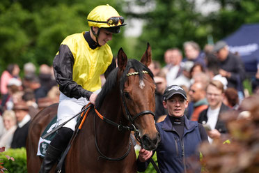 Gestern fand der letzte Renntag des Derby-Meetings statt. Zwei Starter waren vor Ort. Adlerstolz konnte vor dem Mittag seine Maidenschaft ablegen. Mithilfe der Scheuklappen konnte sich der Schützling vom Stall Nizza besser fokussieren, obwohl laut Andrasch Starke noch viel Potential in dem dreijährigen Hengst steckt, denn er schaute sich vorne noch alles ganz genau an. Am späteren Nachmittag fand dann zum Abschluss noch der Grosse Preis von Lotto Hamburg statt. Ein Gruppe III über 2000m, mit von der Partie war die Wiedingerin Egina. Kurz vor dem Rennen begann es in Strömen zu Regnen, was grundsätzlich für Egina kein Problem darstellen sollte. Unterwegs war die Stute dann aber doch etwas schwerfällig und musste früh von Andrasch aufgemuntert werden. Sie reagierte aber auf die Hilfen und konnte im Einlauf einige Konkurrenten einsammeln und wurde noch dritte.